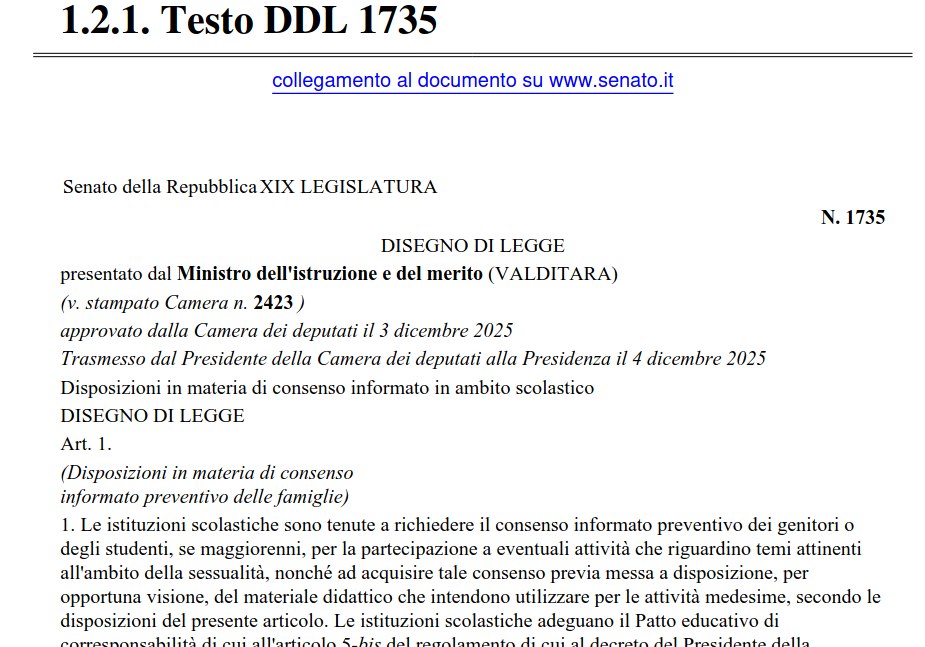 Analizziamo il testo di legge (4 articoli) sul consenso informato preventivo che il 3 dicembre la Camera ha approvato e che adesso passa al Senato: passiamo in rassegna la serie di paletti, compreso nessuno stanziamento economico, che impediranno di fatto qualsiasi seria educazione sessuoaffettiva nelle scuole, in orario scolastico o extra. I crediti di Sasso a Pro Vita.