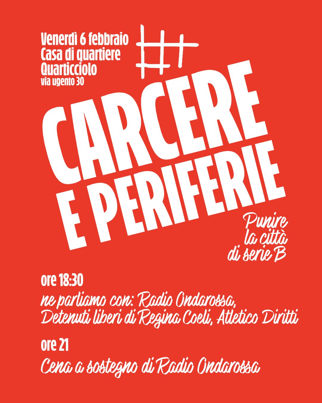 Carcere e Periferie Venerdì 6 Febbraio 2026 - 01:00 Casa di quartiere Quarticciolo - Via Ugento 30 Tipo evento Iniziativa di Radio Ondarossa [Carcere]