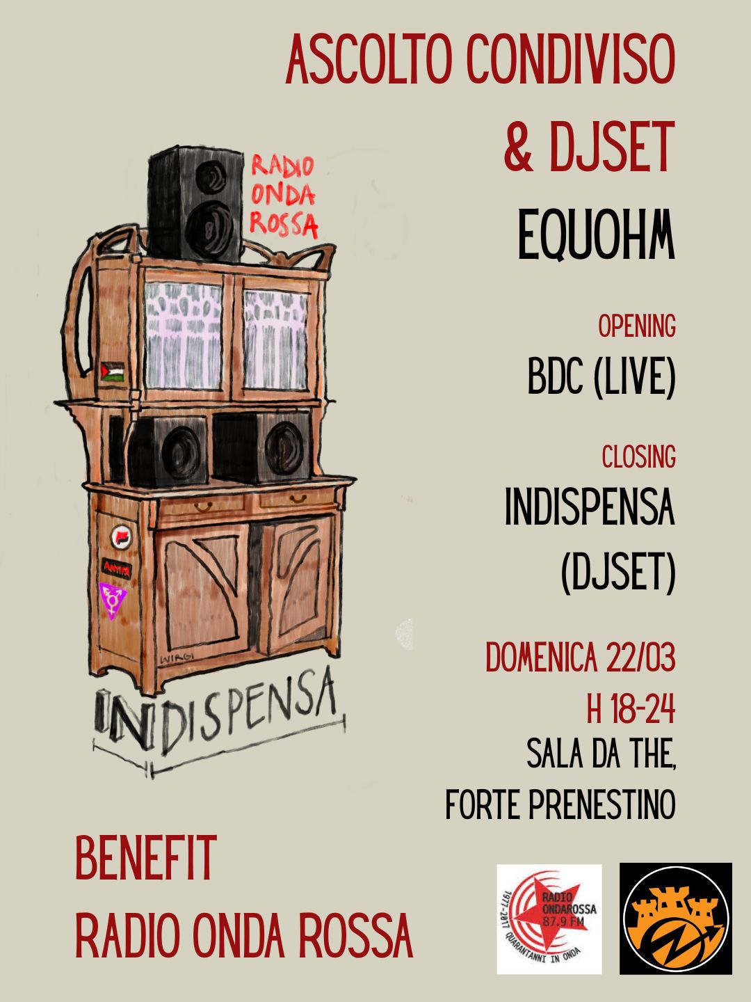 22 marzo Ascolto condiviso e Djset per Radiondarossa Domenica 22 Marzo 2026 - 18:00 CSOA Forte Prenestino Tipo evento Iniziativa di Radio Ondarossa