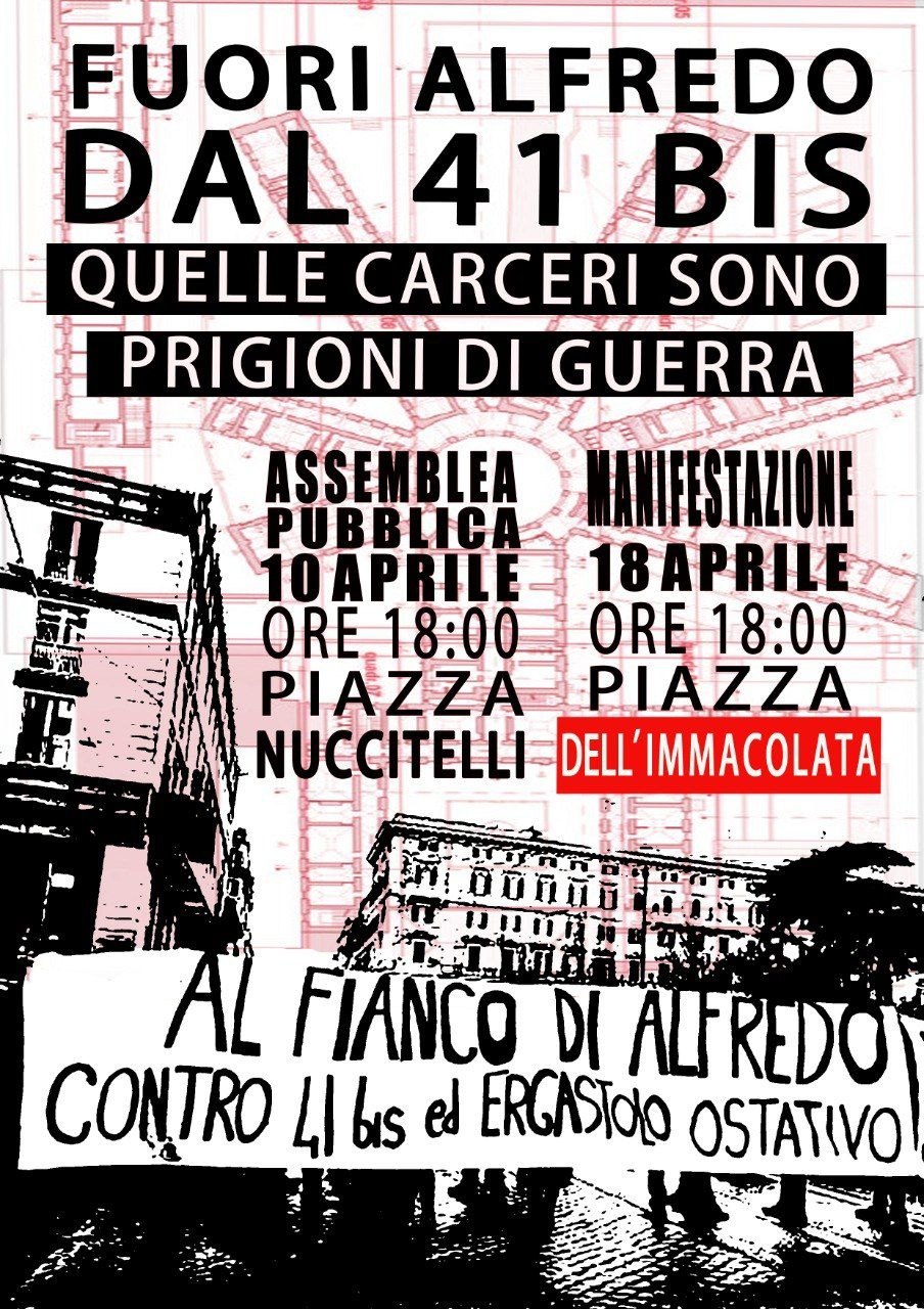 La solidarietà con Alfredo non è mai stata solo una lotta per Alfredo. Come più volte si è detto, un anarchico in 41bis oggi è un avvertimento per tutt, poichè questa ulteriore estensione di quel regime carcerario costituisce una delle punte più avanzate dell’attuale fase reazionaria. L’accanimento contro di lui, infatti, ha come principale spiegazione la volontà di chiudere la partita con ogni forma di dissenso, da quelle radicali a quelle consentite.