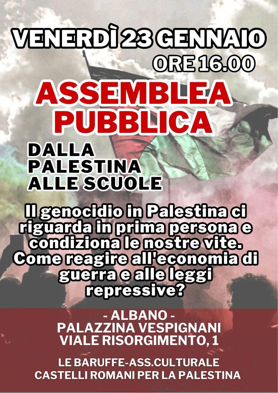 In comunicazione telefonica con un compagno solidale con la Palestina, abbiamo parlato dell'assemblea pubblica che si terrà, questo venerdì 23 gennaio a partire dale ore 16:00, ad Albano per parlare di come il genocidio in Palestina condiziona le nostre vite e di come reagire all'economia di guerra e alle leggi repressive.