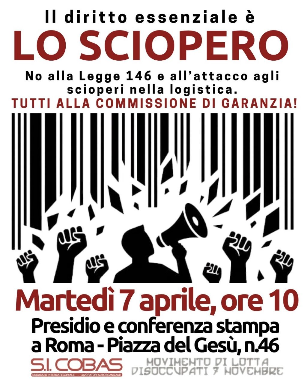 Martedรฌ 7 aprile 2026 sit-in a piazza del Gesรน a Roma per la salvaguardia del diritto di sciopero nel settore della logistica. A seguire il comunicato del SI-Cobas.