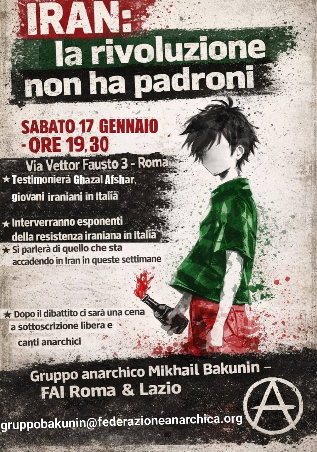 Come Gruppo Anarchico Mikhail Bakunin, FAI Roma e Lazio siamo solidali con l'insurrezione popolare iraniana. Per questo motivo abbiamo organizzato un dibattito sabato 17 gennaio, dalle ore 19:30, nella nostra sede di via Vettor Fausto 3 (Metro B - Roma Garbatella), con Ghazal Afshar, portavoce dell'Associazione Giovani Iraniani in Italia ed altr? esponenti della resistenza iraniana. Dal 28 dicembre è in corso una rivolta popolare in Iran. Partita inizialmente come protesta contro l'altissima inflazione, la svalutazione del rial e la disoccupazione, si è rapidamente trasformata in una rivolta politica contro il regime teocratico, mettendo in crisi l'intero sistema di potere fondato su repressione, patriarcato, controllo sociale e violenza istituzionale. Come anarchich? siamo solidali con chi si ribella, al cui interno sono presenti anche nostr? comp. Lo Stato iraniano si sente in pericolo e attua una repressione selvaggia: le forze di sicurezza hanno aperto il fuoco su manifestanti causando centinaia di morti. Gli ospedali sono al collasso, le prigioni si riempiono, le case vengono perquisite. La magistratura promette processi senza clemenza e dichiara che chiunque manifesta sarà condannato a morte: lo Stato dichiara guerra alla popolazione e chiama nemici coloro che si ribellano. Come ogni potere in crisi, il regime tenta di massacrare la popolazione nel silenzio con il blackout quasi totale di internet. Ma nemmeno il silenzio forzato basta. Dalle città filtrano immagini di cortei notturni, slogan contro Khamenei, assalti alla polizia morale e alle sedi governative, mobilitazioni in tutte le città del Paese. Il potere teocratico non è l'unico nemico della rivolta. Come gruppo anarchico respingiamo qualsiasi soluzione che sostituisca un padrone con un altro, sia esso la teocrazia di Khamenei o uno Scià riportato sul trono, fantoccio di Washington. La popolazione iraniana non ha bisogno di nuovi padroni ma di liberarsi da ogni autorità. La solidarietà non è neutrale: o è rivoluzionaria o è complice. Viva l'anarchia! Gruppo Anarchico Mikhail Bakunin - FAI Roma e Lazio