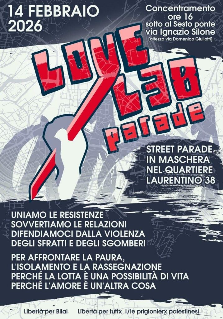 Con compagnx di L38Squat, Zksquat e Bilancione occupato parliamo della Street Parade del 14 Febbraio che avrà luogo nel quartiere Laurentino 38, un momento per unire le resistenze e sovvertire le relazioni, contro la violenza degli sfratti e degli sgomberi, contro la violenza patriarcale.
